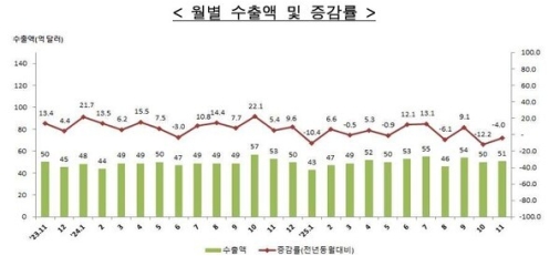 15ÀÏ ÀÎõº»ºÎ¼¼°üÀÌ ¹ßÇ¥ÇÑ ‘2025³â 11¿ù ÀÎõÁö¿ª ¼öÃâÀÔ ÇöȲ’¿¡ µû¸£¸é Áö³´Þ ¼öÃâÀº Àü³â µ¿¿ù ´ëºñ 4.0% °¨¼ÒÇÑ 51¾ï ´Þ·¯, ¼öÀÔÀº 12.3% ÁÙ¾îµç 45¾ï3000¸¸ ´Þ·¯·Î Áý°èµÆ´Ù. ÀÌ¿¡ µû¶ó ¹«¿ª¼öÁö´Â 5¾ï7000¸¸ ´Þ·¯ ÈæÀÚ¸¦ ±â·ÏÇß´Ù. ¼öÃâÀº 10¿ù¿¡ À̾î 2°³¿ù ¿¬¼Ó °¨¼Ò¼¼´Ù.