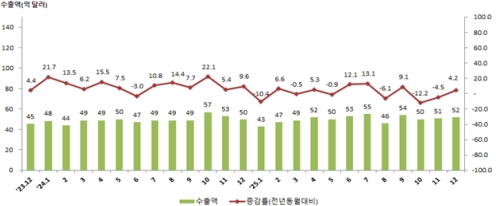 15ÀÏ ÀÎõ¼¼°üÀÌ ¹ßÇ¥ÇÑ ¼öÃâÀÔ ÇöȲ¿¡ µû¸£¸é Áö³ÇØ 12¿ù ÀÎõÁö¿ª ¼öÃâ¾×Àº Àü³â µ¿¿ù ´ëºñ 4.2% Áõ°¡ÇÑ 51¾ï9000¸¸ ´Þ·¯·Î Áý°èµÆ´Ù. ¼öÀÔÀº °°Àº ±â°£ 8.5% °¨¼ÒÇÑ 51¾ï3000¸¸ ´Þ·¯·Î, ¹«¿ª¼öÁö´Â 6000¸¸ ´Þ·¯ ÈæÀÚ¸¦ ±â·ÏÇß´Ù. ¼öÃâÀº 2°³¿ù ¸¸¿¡ Áõ°¡¼¼·Î ÀüȯµÆÀ¸¸ç, ¼öÀÔÀº 5°³¿ù ¿¬¼Ó °¨¼Ò¼¼¸¦ À̾´Ù.